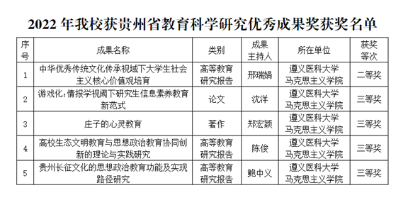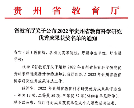 近日,贵州省教育厅发布了《关于公布2022年贵州省教育科学研究优秀成果奖名单的通知》,公司共有5项成果获奖,均为tyc33455cc太阳集团教师获得。其中,二等奖1项,三等奖4项,获奖数量位居全省高校第四名,蝉联我省医学类高校第一名。