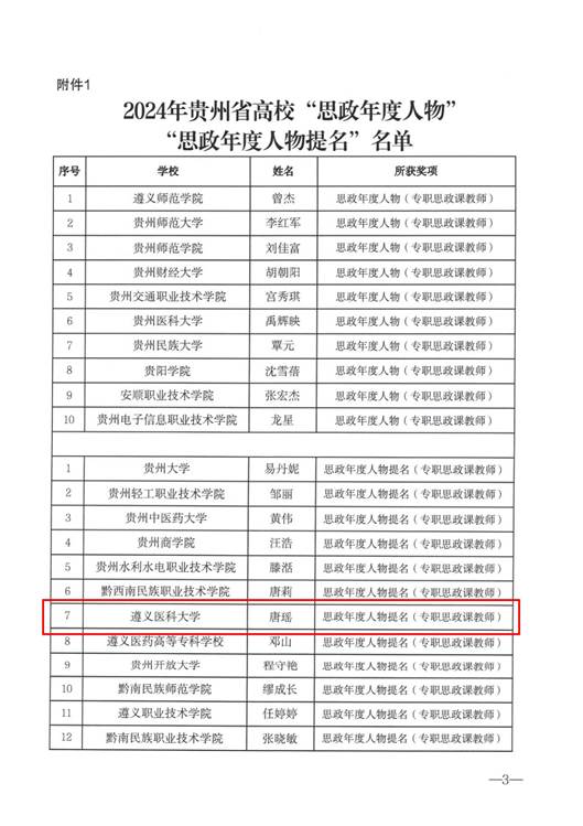 10月31日,贵州省委教育工委、省教育厅正式印发《省委教育工委 省教育厅关于公布“思政年度人物”“思政年度人物提名”“思政新秀”评选结果的通知》(以下简称“通知”),公司教师唐瑶和沈洋分别入选“思政年度人物提名”(专职思政课教师)和“思政新秀”(专职思政课教师)。同时,思想政治教育专业导师王纪鹏和张在金分别入选“思政年度人物”(宣传队伍)和“思政新秀”(宣传队伍)。此外,公司员工工作部(处)谢国秀老师入选“思政年度人物”(学工队伍)。