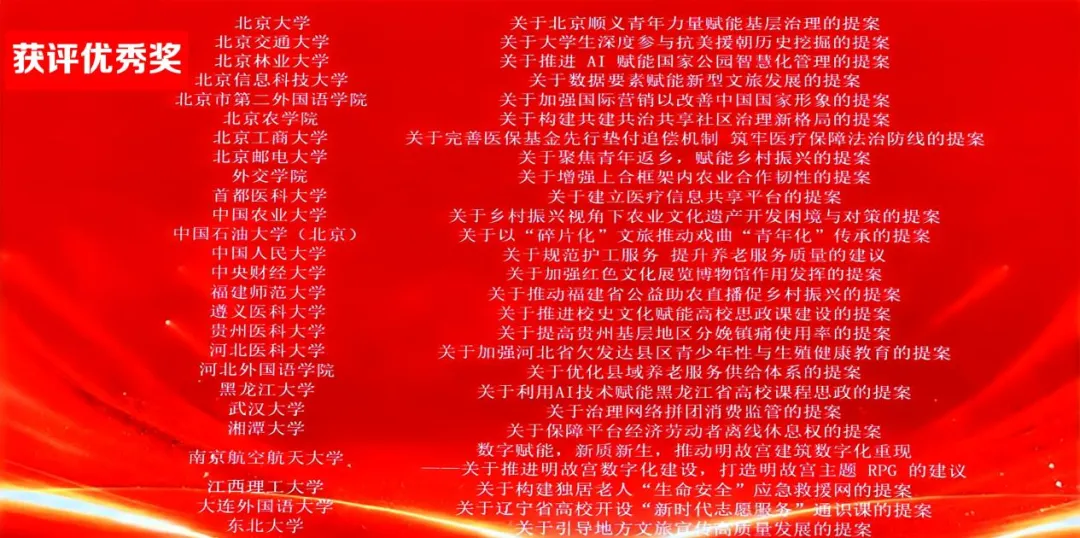 近日,提案中国·第十二届全国老员工模拟政协提案大赛总决赛落下帷幕。本届大赛自2025年6月启动,经过前期严格审核和遴选,最终,公司项目《关于推进校史文化赋能高校思政课建设的提案》作为贵州2个入围高校项目之一,与来自北京大学、中国人民大学、武汉大学等51所高校项目齐聚北京同台角逐。该项目由tyc33455cc太阳集团副经理沈洋、校团委书记余春玲联合指导,tyc33455cc太阳集团本科生和“骏马”宣讲团成员共同完成。在全国总决赛中,经过提案展示、答辩评审和模拟协商座谈等环节,获大学组优秀奖。