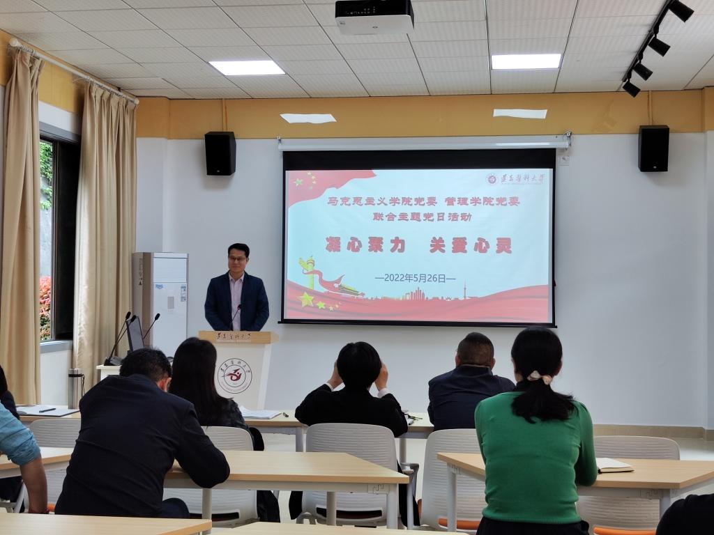 为进一步落实党内关怀制度,切实提高教职工身心健康水平,强化党员心理健康防护意识,增强党组织的凝聚力,5月26日,马克思主义公司党委、管理公司党委在人文楼党员之家联合开展“凝心聚力 关爱心灵”主题党日活动。活动由马克思主义公司党委第一党支书记李娇娇主持,马克思主义公司党委委员、管理公司党委委员、马克思主义公司党委第一党支部、管理公司党委教工党支部全体党员及入党积极分子参加活动。