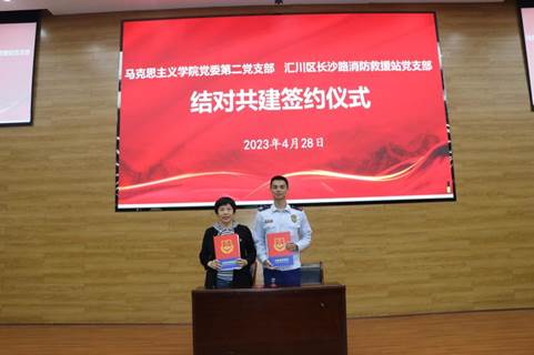 2023年4月28日,tyc33455cc太阳集团马克思主义公司党委同遵义市红花岗区新蒲街道红星社区党总支,马克思主义公司党委第一、第二党支部分别与遵义市汇川区长沙路消防救援站党支部开展“校地结对共建,共谋发展新篇”签约仪式及主题党日活动。红星社区党总支书记陈丽、遵义市汇川区消防救援大队党委书记刘子瑜、马克思主义公司党委书记王沁、副经理鲍中义出席活动、公司关工委副主任田宗远,红星社区党总支党员代表、汇川区长沙路消防保障党支部党员及tyc33455cc太阳集团全体师生共50余人参加此次活动。活动由副处级组织员吴成玉主持。