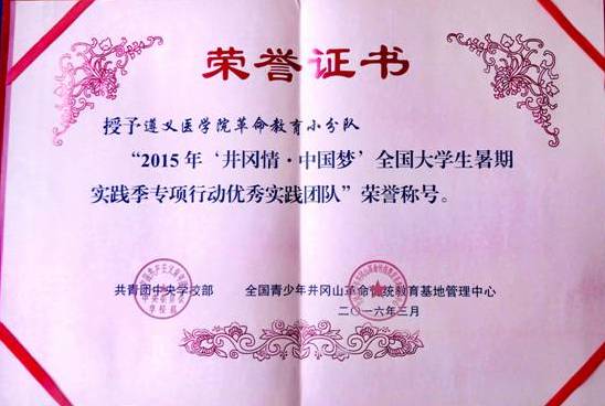 在2015年度“井冈情•中国梦”全国老员工暑期实践季优秀团队评比中,由人文社科公司思政研究生组队,遵义医公司团委推荐的“革命教育小分队”从全国167所高校180支队伍中脱颖而出,喜获共青团中央2015年度“井冈情•中国梦”全国老员工暑期实践季专项行动优秀实践团队奖。